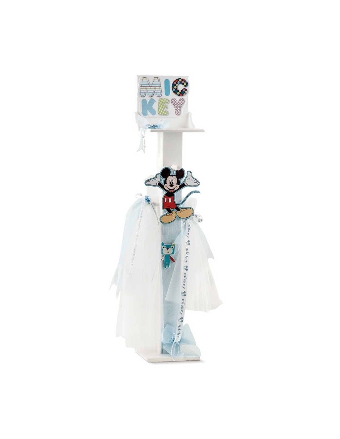 Disney ξύλινος λευκός κηροστάτης-κρεμάστρα, στολισμένος με τούλι λευκό και γάζα σιέλ διακοσμημένος μπροστά με ξύλινη φιγούρα του mickey με ανοιχτά τα χέρια και φανερά χαρούμενος.Στο πάνω μέρος του κηροστάτη υπάρχει ξύλινη ταμπελίτσα πάνω στην οποία αναγράφεται το όνομα του mickey με χειροποίητα γράμματα.