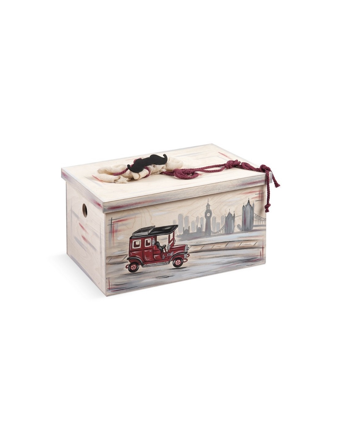 Ξύλινη natural κασέλα, συσκευασία βάπτισης ζωγραφισμένη στο χέρι με θέμα αυτοκίνητο αντίκα κόκκινο να δείχνει πως κάνει τον γύρο του κόσμου. Το καπάκι της κασέλας είναι διακοσμημένο με λινάτσα εκρού, ξύλινο μουστάκι μαύρο και κορδόνι κόκκινο, ενώ όλο το κουτί έχει σβησίματα γκρι-κόκκινα