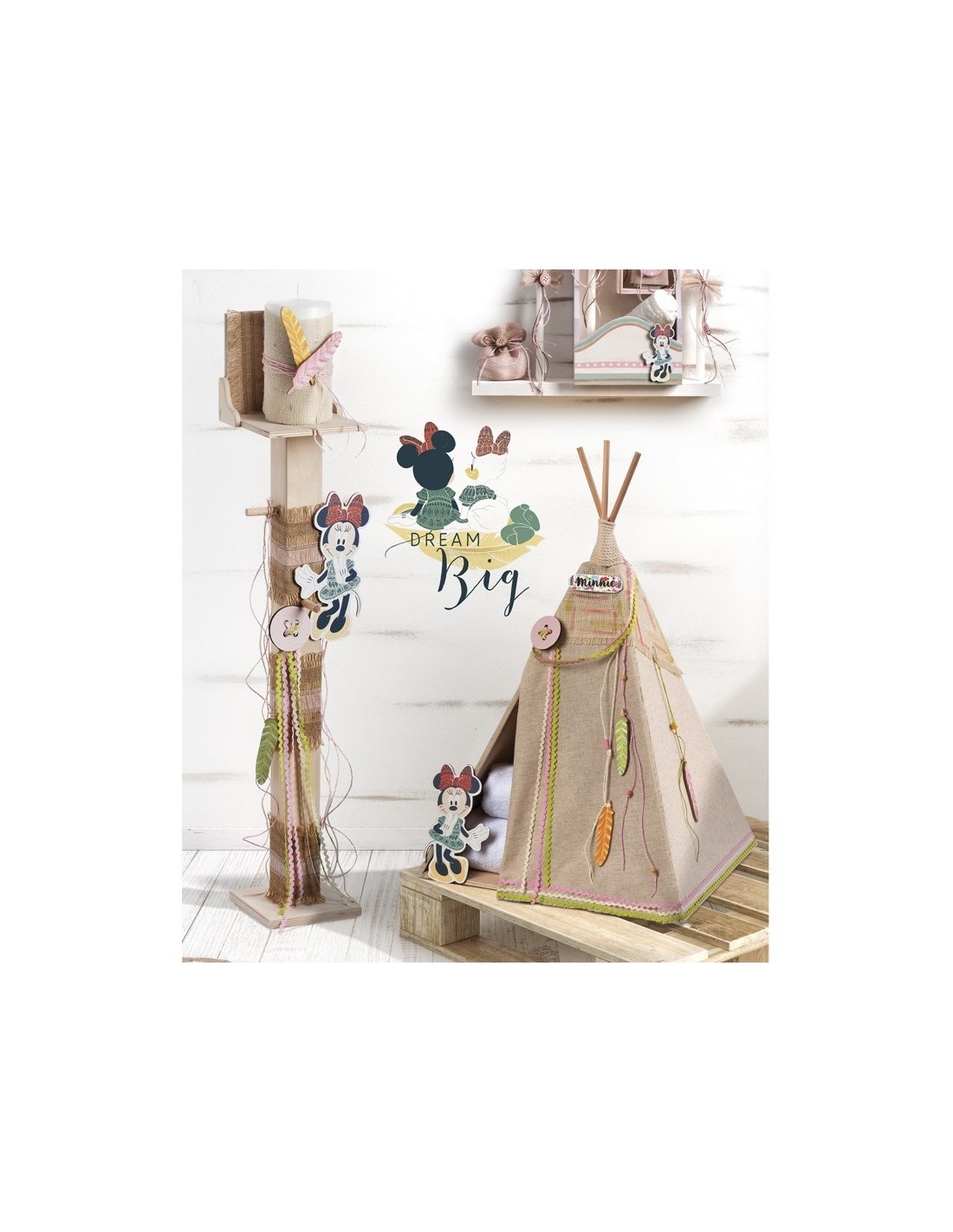 Disney ξύλινος natural κηροστάτης-κρεμάστρα, διακοσμημένος με τσουβάλι σε φυσικές-ροζ αποχρώσεις,με την ξύλινη φιγούρα της Minnie σε ethnic στυλ και πολλά ethnic στοιχεία σε χρώματα βεραμάν,ροζ,πορτοκαλί.