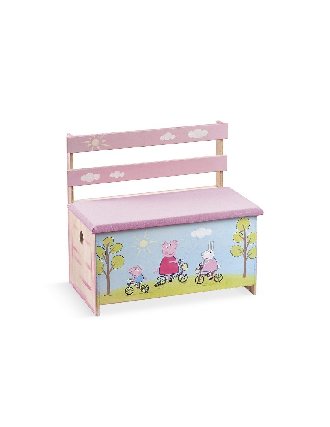 Ξύλινο natural παγκάκι, συσκευασία βάπτισης ζωγραφισμένη στο χέρι με την πέππα το γουρουνάκι να κάνει ποδήλατο με τους φίλους της και την οικογένειά της. Η πλάτη του κουτιού είναι ζωγραφισμένη ροζ με συννεφάκια και ήλιο, το καθισματάκι είναι ντυμένο με μαξιλαράκι με ύφασμα ροζ ενώ όλο το κουτί έχει σβησίματα ροζ