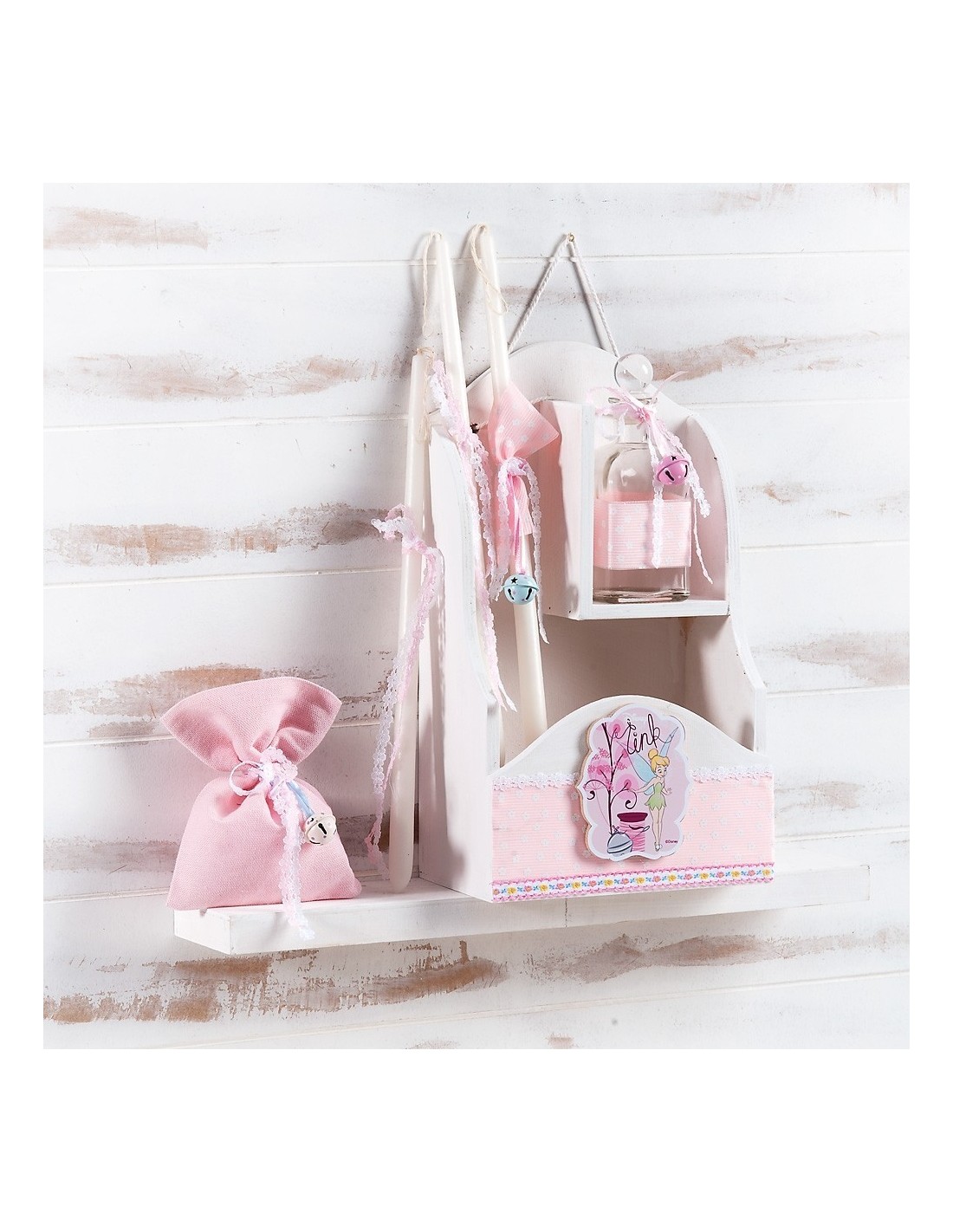 Disney Tinker Bell λευκή κρεμαστή συσκευασία που χρησιμέυει ως ράφι λαδικών. Στο μπροστινό μέρος έχει κολληθεί print floral ροζ ύφασμα και ξύλινη παράσταση που απεικονίζει την Tinker Bell. . Ο κωδικός περιλαμβάνει τα 3 κεράκια, το σαπούνι μέσα σε πουγκάκι και το μπουκάλι του λαδιού, όλα στολισμένα σε ροζ αποχρώσεις.