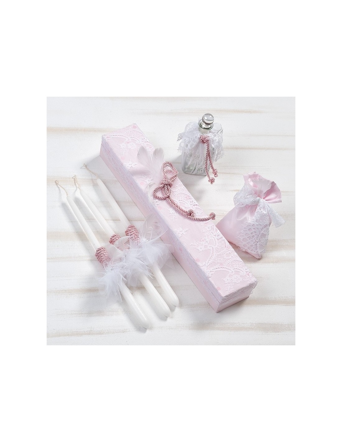 Ξύλινο κουτί συσκευασίας παραλληλόγραμμο ζωγραφισμένο στο χέρι σε ροζ χρώμα με πουά ροζ πιο έντονα και ντυμένο με δαντέλα λευκή.Ο κωδικός περιλαμβάνει τα 3 κεράκια,το σαπούνι μέσα σε πουγκάκι και το μπουκάλι του λαδιού,όλα στολισμένα σε λευκές-ροζ αποχρώσεις.