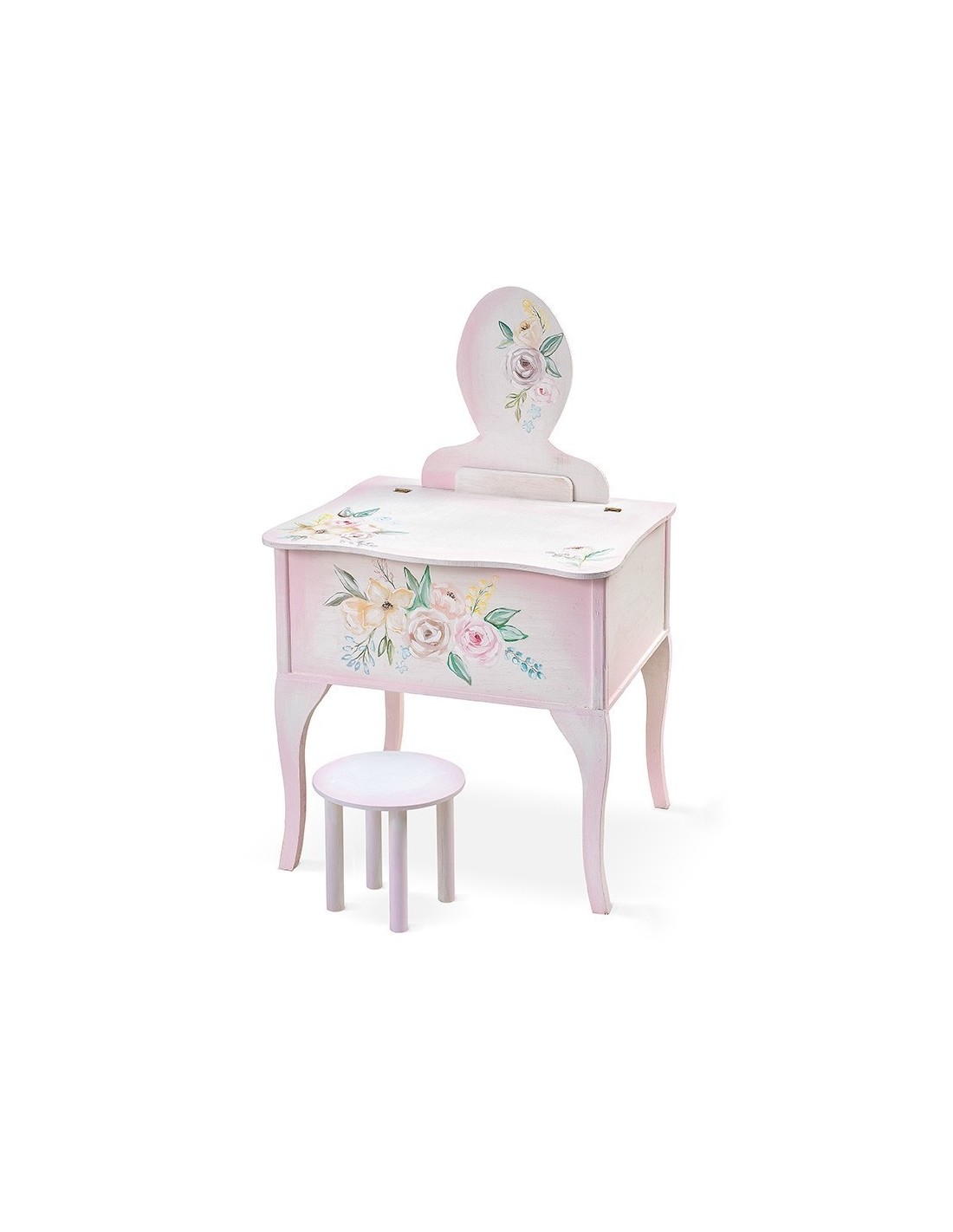 Ξύλινη natural τουαλέτα,συσκευασία βάπτισης ζωγραφισμένη στο χέρι με θέμα τα λουλούδια.Όλο το κουτί είναι σε αποχρώσεις λευκές-ροζ με πολύχρωμες συνθέσεις λουλουδιών.Στην τιμή περιλαμβάνεται και το σκαμπό.