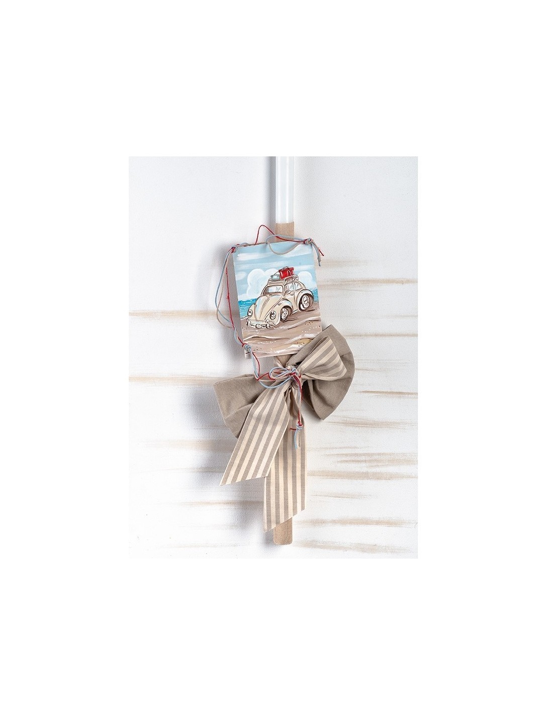 Λαμπάδα βάπτισης δεμένη με λινάτσα σε φυσική απόχρωση και διακοσμημένη με ξύλινο καδράκι ζωγραφιστό με σκαραβαίο το οποίο απεικονίζεται να είναι φορτωμένο με βαλίτσες δίπλα στη θάλασσα.Κάτω ακριβώς από το καδράκι διακοσμεί τη λαμπάδα διπλός βαμβακερός φιόγκος σε καφέ και ριγέ καφέ απόχρωση ενώ όλη η λαμπάδα διακοσμείται επιπλέον από κορδόνια καφέ-κόκκινο και σιέλ.