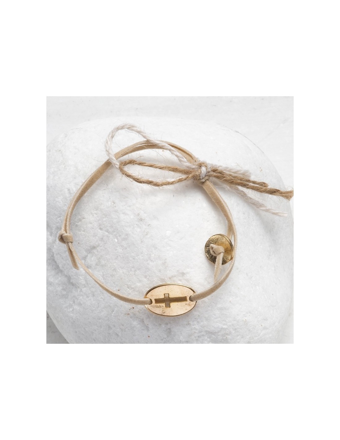 Μαρτυρικό βραχιόλι εκρού με επίχρυσο σταυρό και κορδόνι εκρού-καφέ.